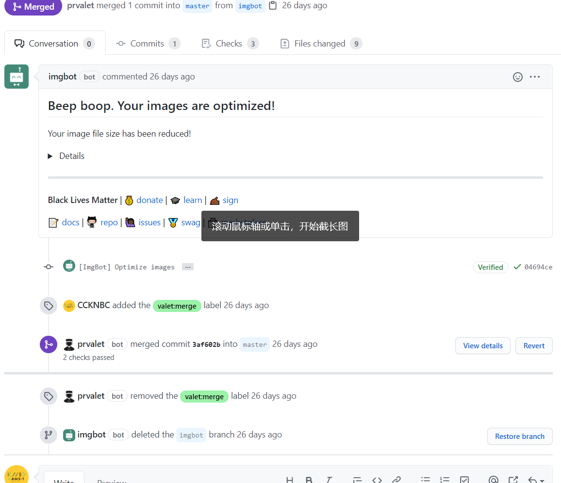 也就是在仓库启用后,去编辑一下 label 标签,添加一个名为valet:merge的标签,而机器人提交了 PR 后,我们打上这个标签,便会自动执行合并操作,之后 imgbot 将删除由imgbot创建的分支 imgbot,方便下次在进行自动压缩,提交 PR